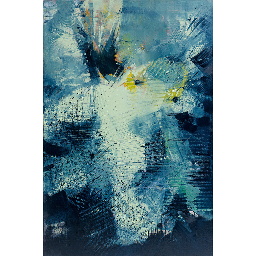 I love it when music interacts with me and finds its way onto my canvas. It feels spiritual and infinite. I want this joy and sensation of movement to dance me to the end of my days. Despite its monochromatic palette, the striking color contrasts, mixed with the textured tool marks, show movement and definition. I can almost see someone twirling to the music.