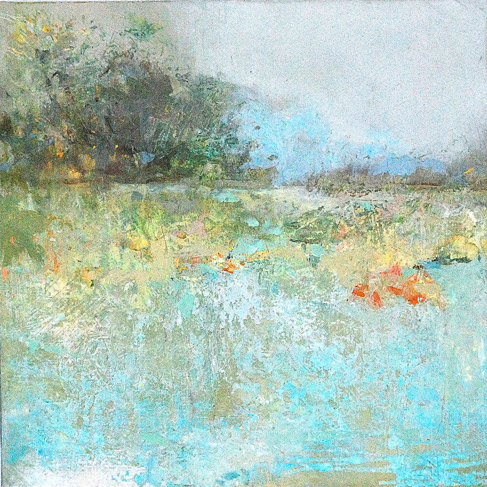 A luscious green field in summer curves around the shores of a sun-drenched lake. Splashes of green dotted across the water add to the bucolic scene. This palette of colors expresses the joy of a sunny day in the middle of July. With the three-dimensional textures, we can feel the cool waters beckon us forth.